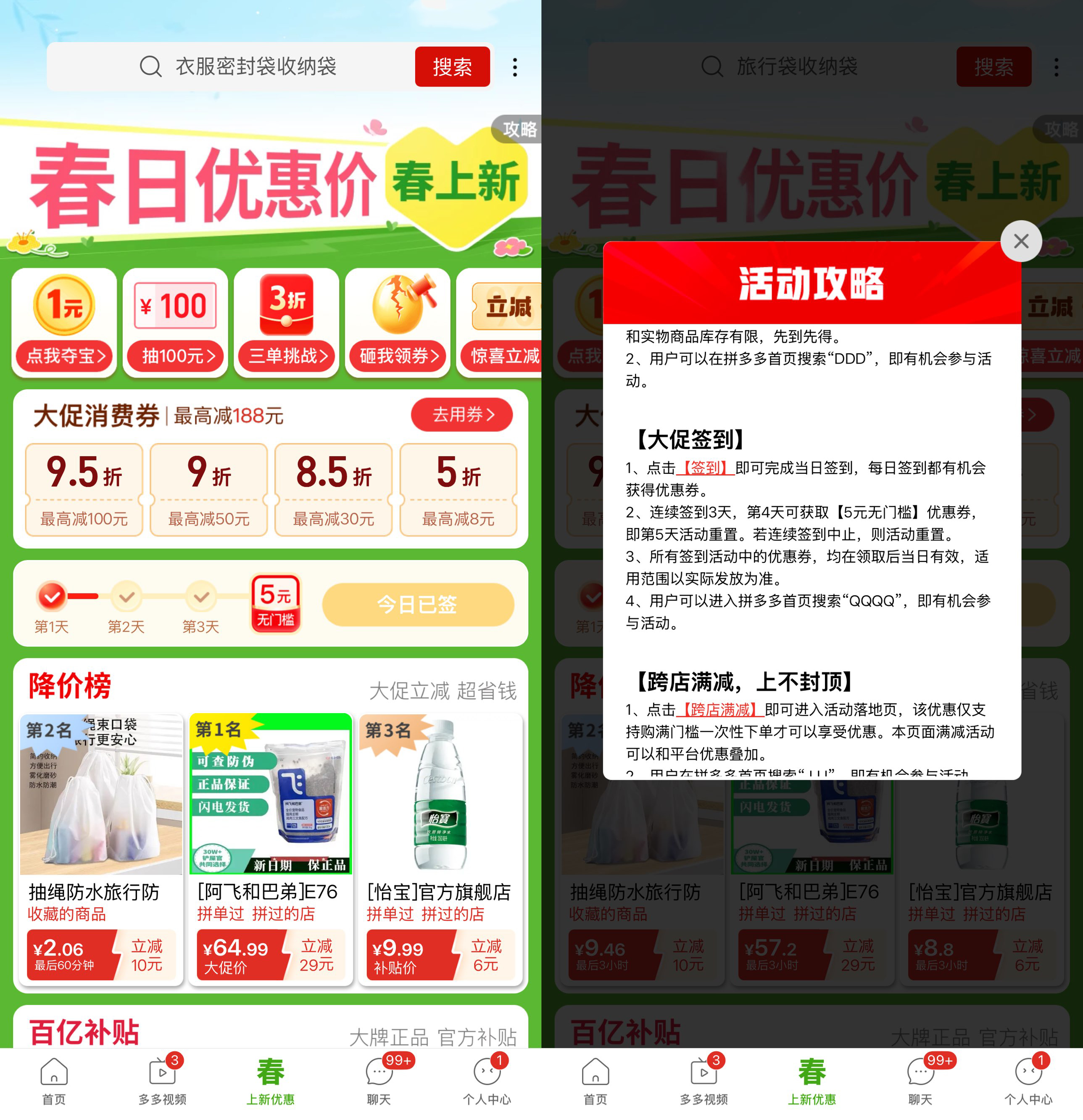 拼多多APP搜索>QQQQ>连续签到4天领取5元无门槛券!