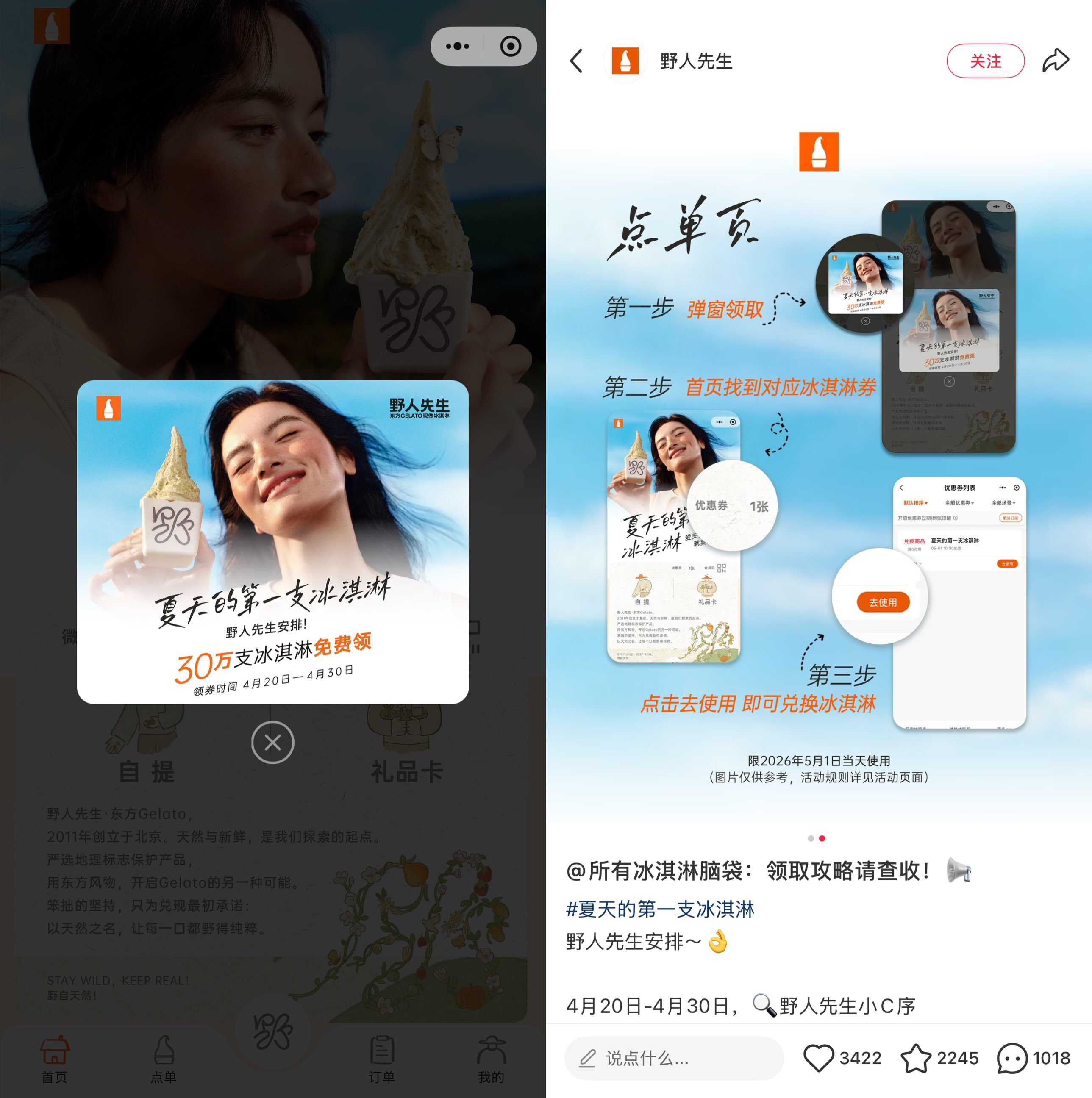 微信搜索小程序>野人先生>4月20日-30日每天12/16/21点整>领取免费冰淇淋券!
