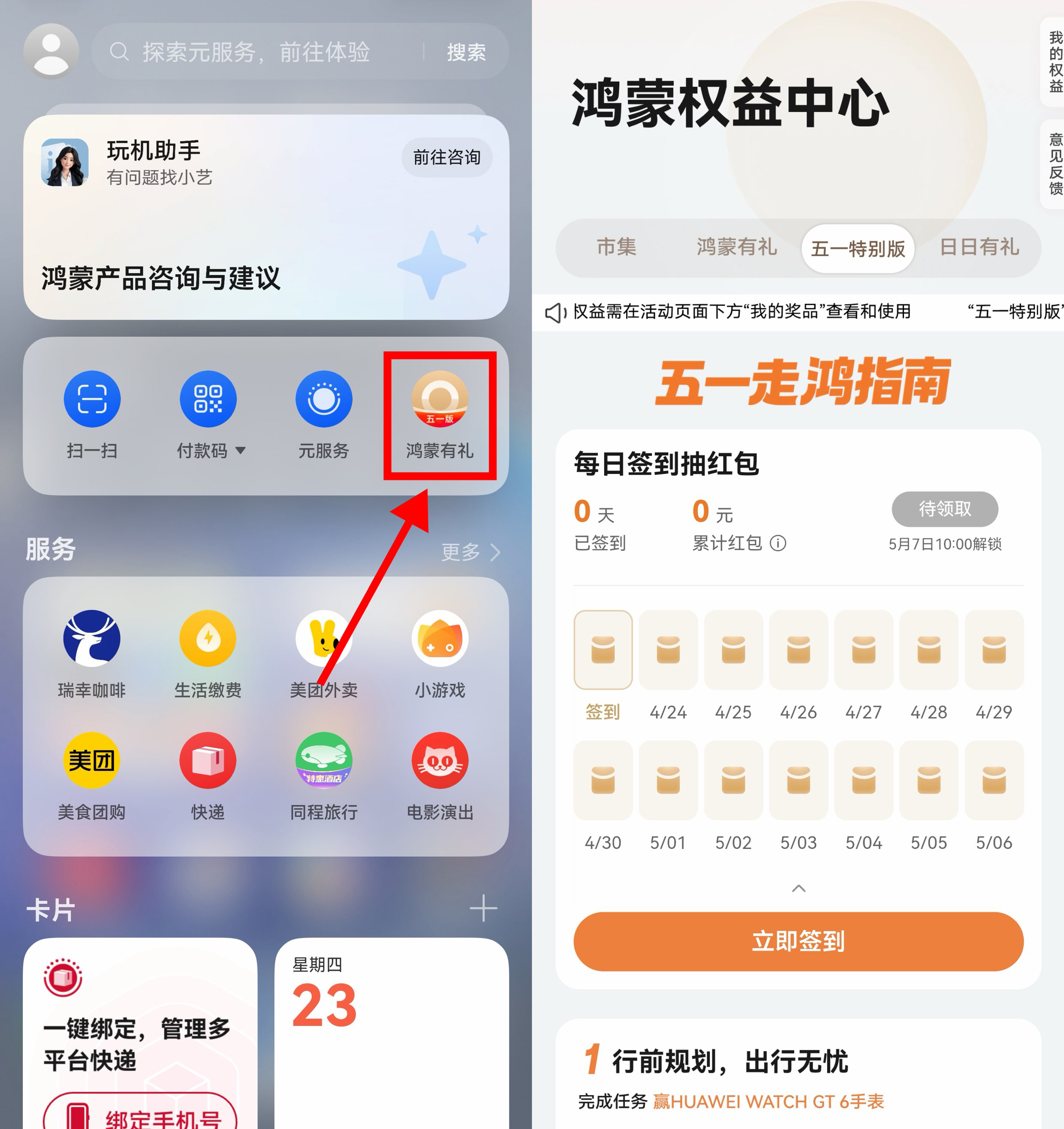 华为鸿蒙系统>负一屏>鸿蒙有礼>五一特别版>每天签到领取红包!