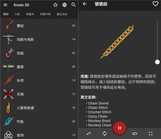 3D绳结(Knots 3D)是一款通过3D模型的方式教你如何打安全绳结的软件。有时候生活中的一些小技能学着总是有些用的,说不定就能在危急时刻救你一命。这款软件做的3D绳结模型非常逼真,可以轻松掌握一些特殊的绳结打法,让你对绳结有全新的认识,一根绳子,玩得开心。