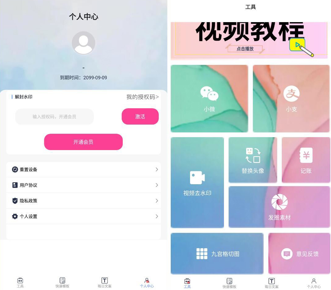 1.小歪微商新版本app功能丰富,比如视频去水印、替换头像、记账、发圈素材。九宫格切图。以及意见反馈等功能为用户提供。